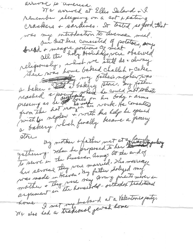 We arrived at Ellis Island & I remember sleeping on a cot & eating crackers and sardines. It tasted so good, that was my introduction to American meal. Our diet here consisted of potatoes, soup, bread, and meagre portions of meat. All the holy Holidays were observed religiously, which we still do, and always there was home baked challah & cake. My father’s nephew was a baker and owned a bakery store. My father reached a point where he could not tolerate pressing as he developed boils on his body and arms from the hot iron used in his work. He consulted with his nephew and with his help he opened a bakery which finally became a grocery store.