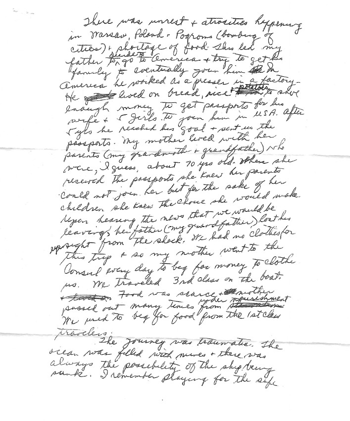 There was unrest & atrocities happening in Warsaw, Poland-- Pogroms (bombing of cities) & shortage of food. This led my father to decide to go to America & try to get his family to eventually join him. In America he worked as a presser in a factory—He lived on bread, rice & potatoes to save enough money to get passports for his wife and 5 girls to join him in USA. After 5 yrs. he reached his goal and sent us the passports. My mother lived with her parents (my grandmother and grandfather) who were, I guess, about 70 years old. When she received the passports, she knew her parents could not join her but for the sake of her children, she knew the choice she would make. Upon hearing the news that we would be leaving, her father (my grandfather) lost his eyesight from the shock. We had no clothes for this trip and so my mother went to the Consul every day to beg for money to clothe us. We traveled 3rd class on the boat. The food was scarce and mother passed out many times from undernourishment. We used to beg for food from the 1st class travelers.